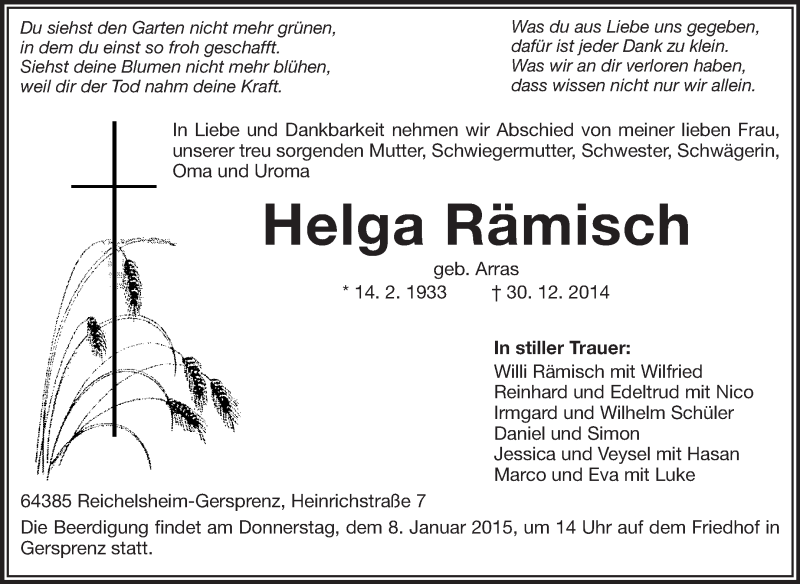 Hier finden Sie alle Traueranzeigen aus der Zeitung, die bisher für Helga Rämisch erschienen sind. Weitere Traueranzeigen, die in der Zeitung erscheinen, werden hier ebenfalls aufgelistet
