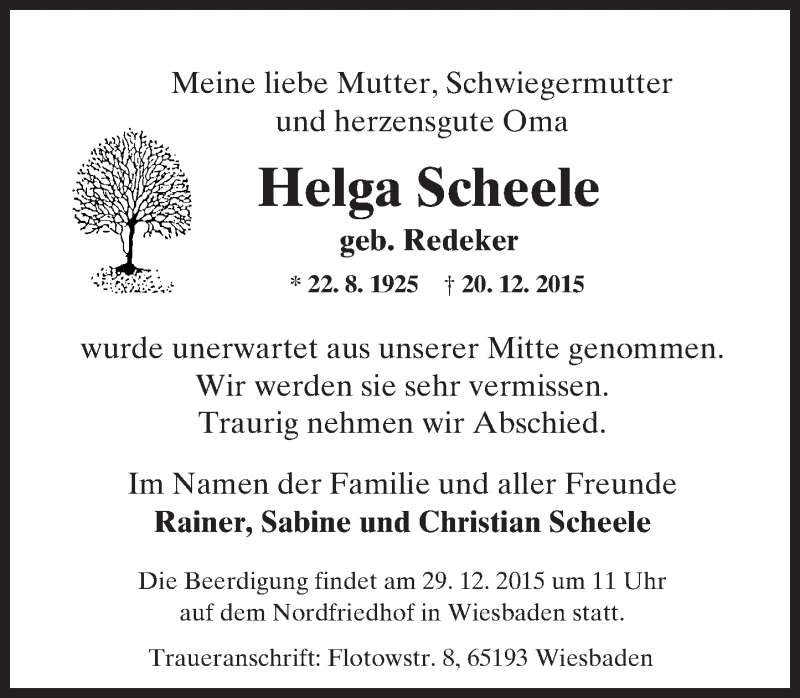 Hier finden Sie alle Traueranzeigen aus der Zeitung, die bisher für Helga Scheele erschienen sind. Weitere Traueranzeigen, die in der Zeitung erscheinen, werden hier ebenfalls aufgelistet