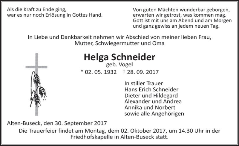 Hier finden Sie alle Traueranzeigen aus der Zeitung, die bisher für Helga Schneider erschienen sind. Weitere Traueranzeigen, die in der Zeitung erscheinen, werden hier ebenfalls aufgelistet