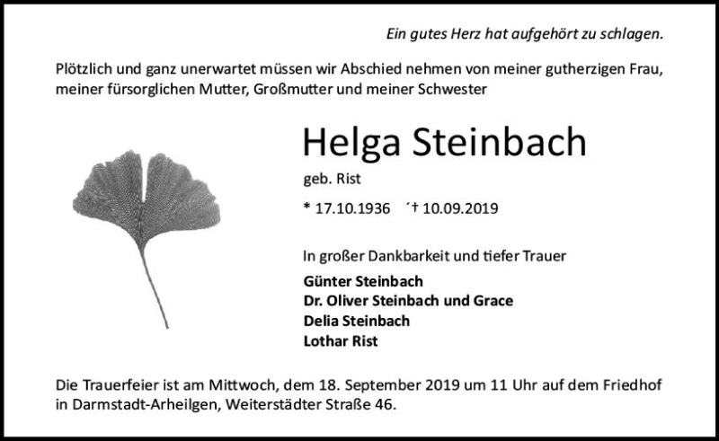 Hier finden Sie alle Traueranzeigen aus der Zeitung, die bisher für Helga Steinbach erschienen sind. Weitere Traueranzeigen, die in der Zeitung erscheinen, werden hier ebenfalls aufgelistet