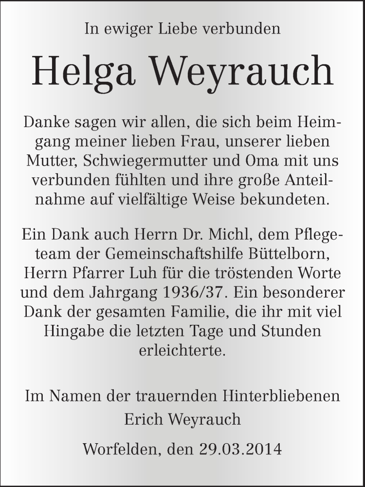 Hier finden Sie alle Traueranzeigen aus der Zeitung, die bisher für Helga Weyrauch erschienen sind. Weitere Traueranzeigen, die in der Zeitung erscheinen, werden hier ebenfalls aufgelistet