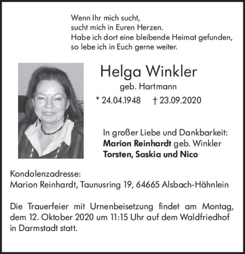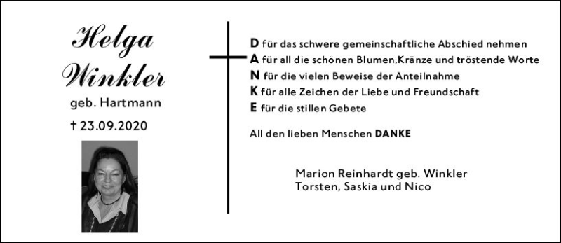 Hier finden Sie alle Traueranzeigen aus der Zeitung, die bisher für Helga Winkler erschienen sind. Weitere Traueranzeigen, die in der Zeitung erscheinen, werden hier ebenfalls aufgelistet