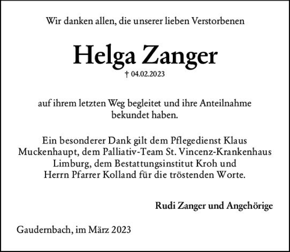 Hier finden Sie alle Traueranzeigen aus der Zeitung, die bisher für Helga Zanger erschienen sind. Weitere Traueranzeigen, die in der Zeitung erscheinen, werden hier ebenfalls aufgelistet
