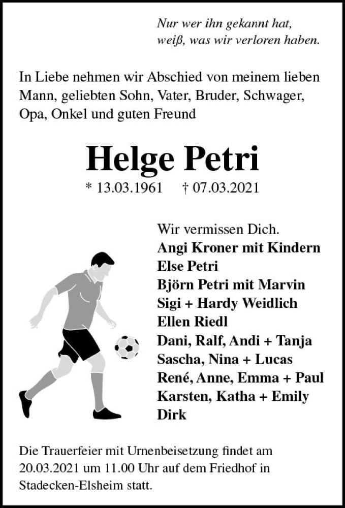 Hier finden Sie alle Traueranzeigen aus der Zeitung, die bisher für Helge Petri erschienen sind. Weitere Traueranzeigen, die in der Zeitung erscheinen, werden hier ebenfalls aufgelistet