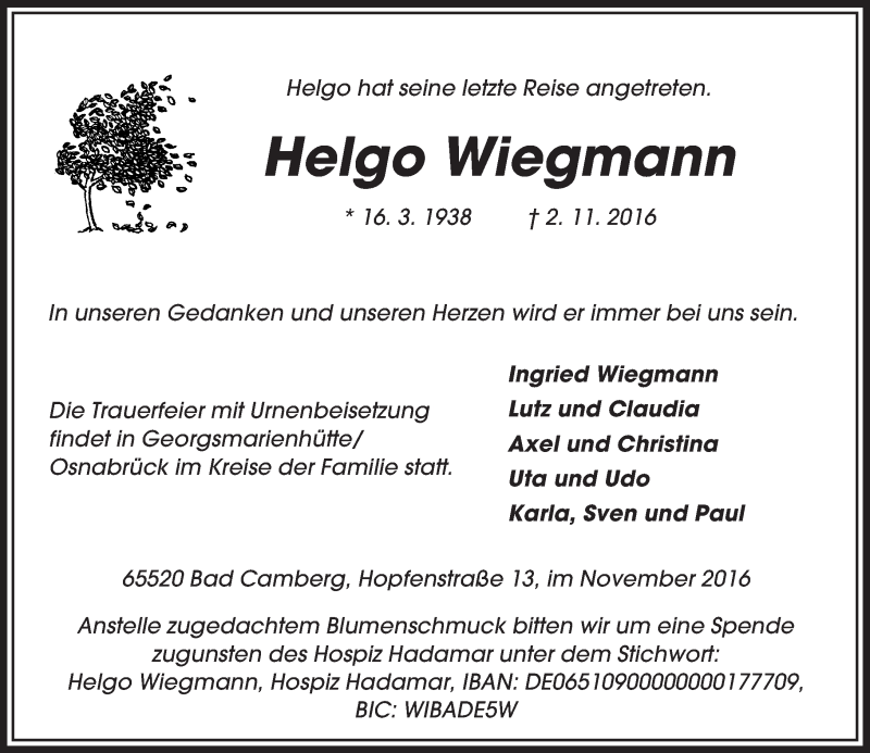 Hier finden Sie alle Traueranzeigen aus der Zeitung, die bisher für Helgo Wiegmann erschienen sind. Weitere Traueranzeigen, die in der Zeitung erscheinen, werden hier ebenfalls aufgelistet