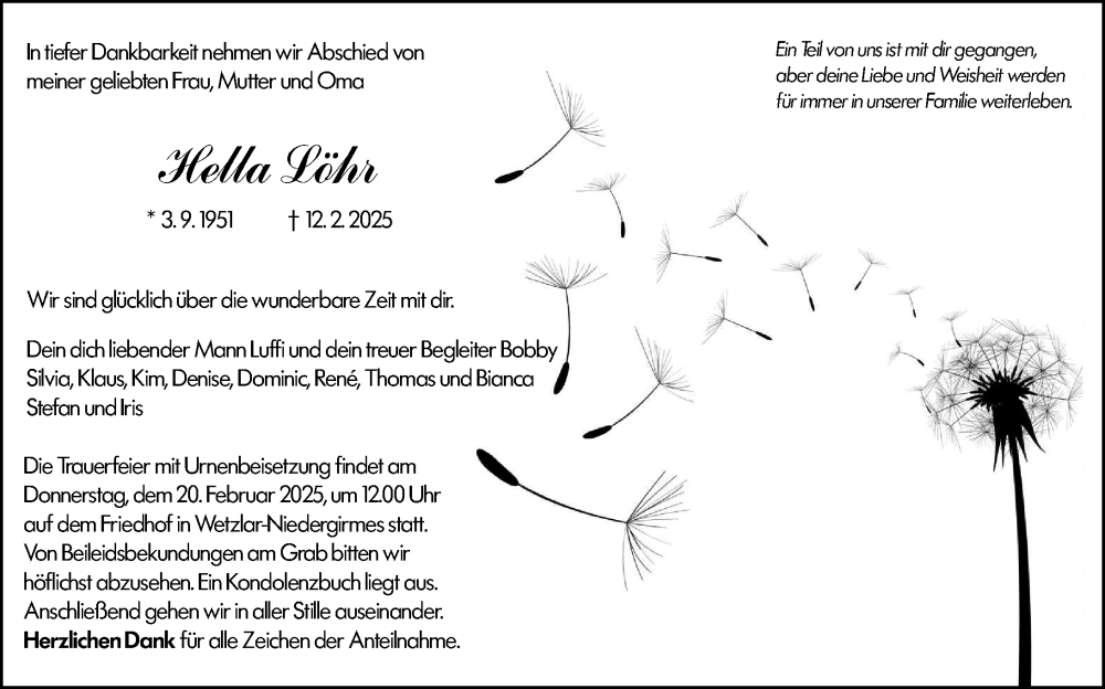 Hier finden Sie alle Traueranzeigen aus der Zeitung, die bisher für Hella Löhr erschienen sind. Weitere Traueranzeigen, die in der Zeitung erscheinen, werden hier ebenfalls aufgelistet