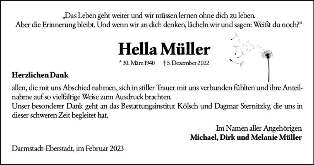 Hier finden Sie alle Traueranzeigen aus der Zeitung, die bisher für Hella Müller erschienen sind. Weitere Traueranzeigen, die in der Zeitung erscheinen, werden hier ebenfalls aufgelistet