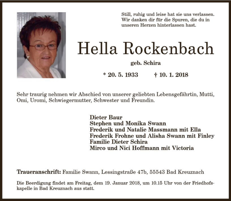 Hier finden Sie alle Traueranzeigen aus der Zeitung, die bisher für Hella Rockenbach erschienen sind. Weitere Traueranzeigen, die in der Zeitung erscheinen, werden hier ebenfalls aufgelistet