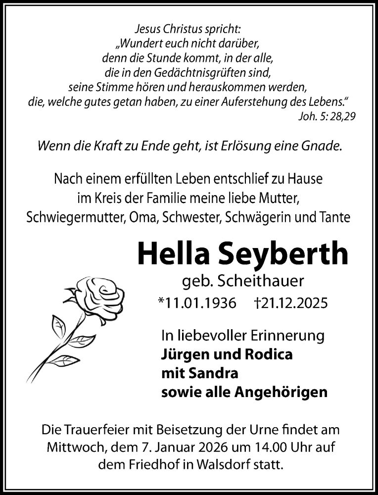 Hier finden Sie alle Traueranzeigen aus der Zeitung, die bisher für Hella Seyberth erschienen sind. Weitere Traueranzeigen, die in der Zeitung erscheinen, werden hier ebenfalls aufgelistet