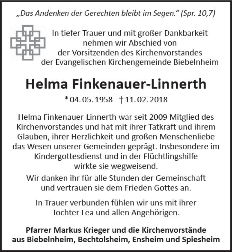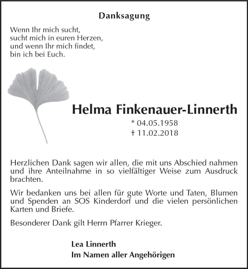 Hier finden Sie alle Traueranzeigen aus der Zeitung, die bisher für Helma Finkenauer-Linnerth erschienen sind. Weitere Traueranzeigen, die in der Zeitung erscheinen, werden hier ebenfalls aufgelistet