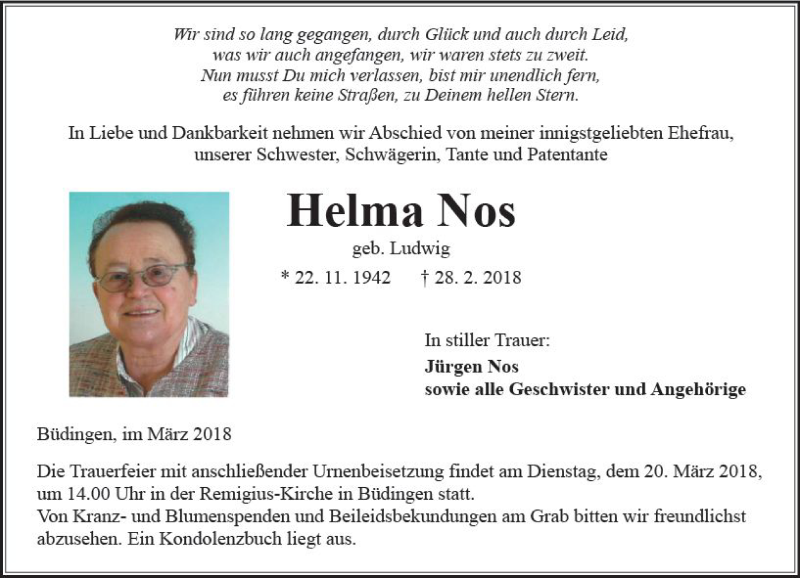 Hier finden Sie alle Traueranzeigen aus der Zeitung, die bisher für Helma Nos erschienen sind. Weitere Traueranzeigen, die in der Zeitung erscheinen, werden hier ebenfalls aufgelistet