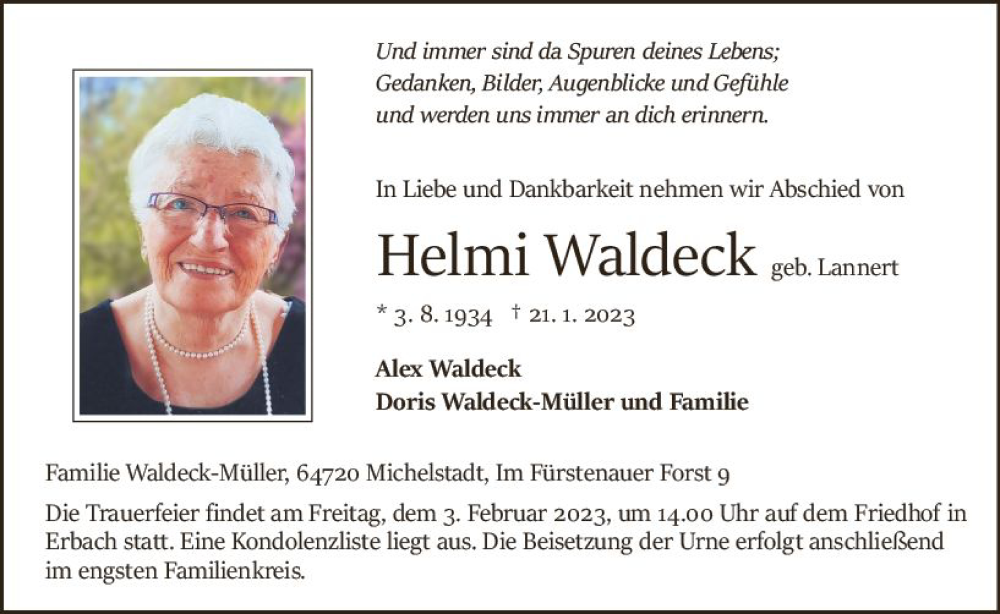 Hier finden Sie alle Traueranzeigen aus der Zeitung, die bisher für Helmi Waldeck erschienen sind. Weitere Traueranzeigen, die in der Zeitung erscheinen, werden hier ebenfalls aufgelistet