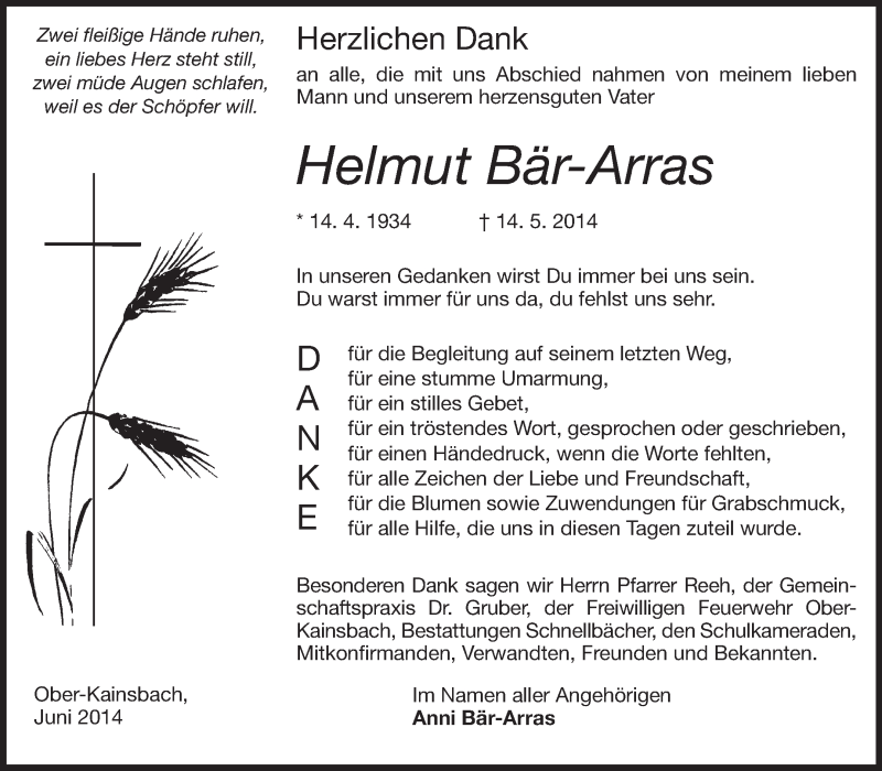 Hier finden Sie alle Traueranzeigen aus der Zeitung, die bisher für Helmut Bär-Arras erschienen sind. Weitere Traueranzeigen, die in der Zeitung erscheinen, werden hier ebenfalls aufgelistet