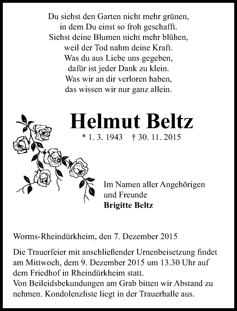 Hier finden Sie alle Traueranzeigen aus der Zeitung, die bisher für Helmut Beltz erschienen sind. Weitere Traueranzeigen, die in der Zeitung erscheinen, werden hier ebenfalls aufgelistet