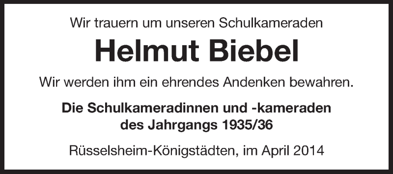 Hier finden Sie alle Traueranzeigen aus der Zeitung, die bisher für Helmut Biebel erschienen sind. Weitere Traueranzeigen, die in der Zeitung erscheinen, werden hier ebenfalls aufgelistet