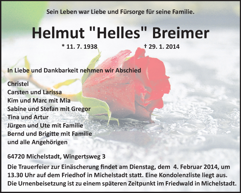 Hier finden Sie alle Traueranzeigen aus der Zeitung, die bisher für Helmut Breimer erschienen sind. Weitere Traueranzeigen, die in der Zeitung erscheinen, werden hier ebenfalls aufgelistet
