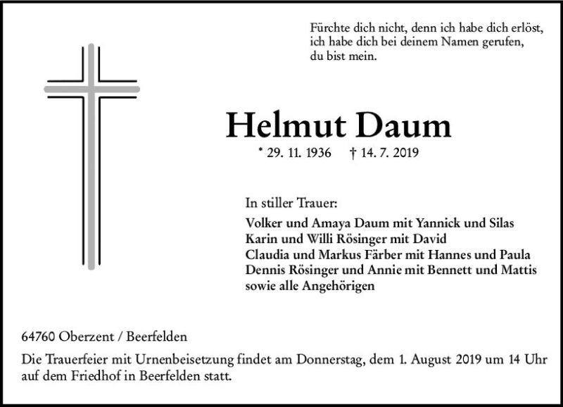 Hier finden Sie alle Traueranzeigen aus der Zeitung, die bisher für Helmut Daum erschienen sind. Weitere Traueranzeigen, die in der Zeitung erscheinen, werden hier ebenfalls aufgelistet