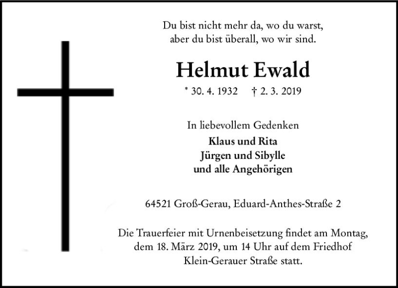 Hier finden Sie alle Traueranzeigen aus der Zeitung, die bisher für Helmut Ewald erschienen sind. Weitere Traueranzeigen, die in der Zeitung erscheinen, werden hier ebenfalls aufgelistet