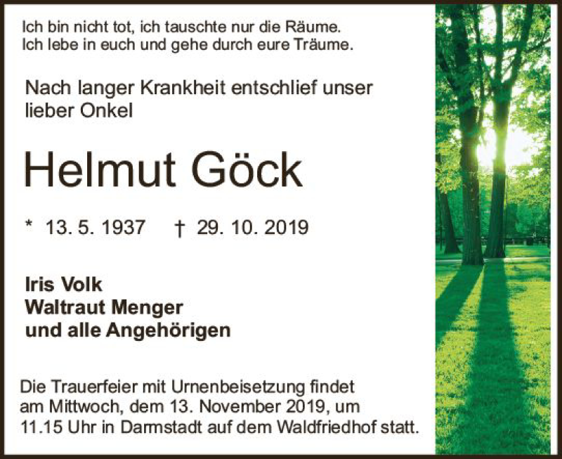 Hier finden Sie alle Traueranzeigen aus der Zeitung, die bisher für Helmut Göck erschienen sind. Weitere Traueranzeigen, die in der Zeitung erscheinen, werden hier ebenfalls aufgelistet