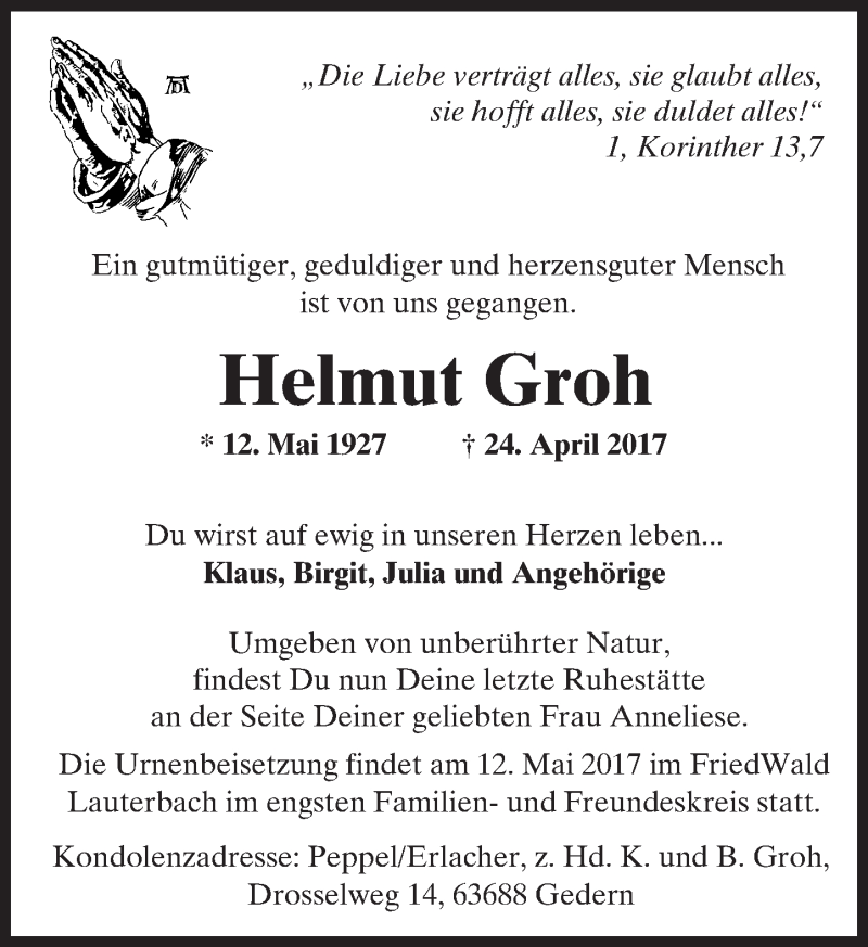 Hier finden Sie alle Traueranzeigen aus der Zeitung, die bisher für Helmut Groh erschienen sind. Weitere Traueranzeigen, die in der Zeitung erscheinen, werden hier ebenfalls aufgelistet