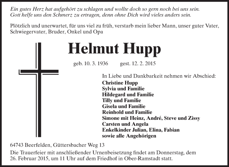 Hier finden Sie alle Traueranzeigen aus der Zeitung, die bisher für Helmut Hupp erschienen sind. Weitere Traueranzeigen, die in der Zeitung erscheinen, werden hier ebenfalls aufgelistet