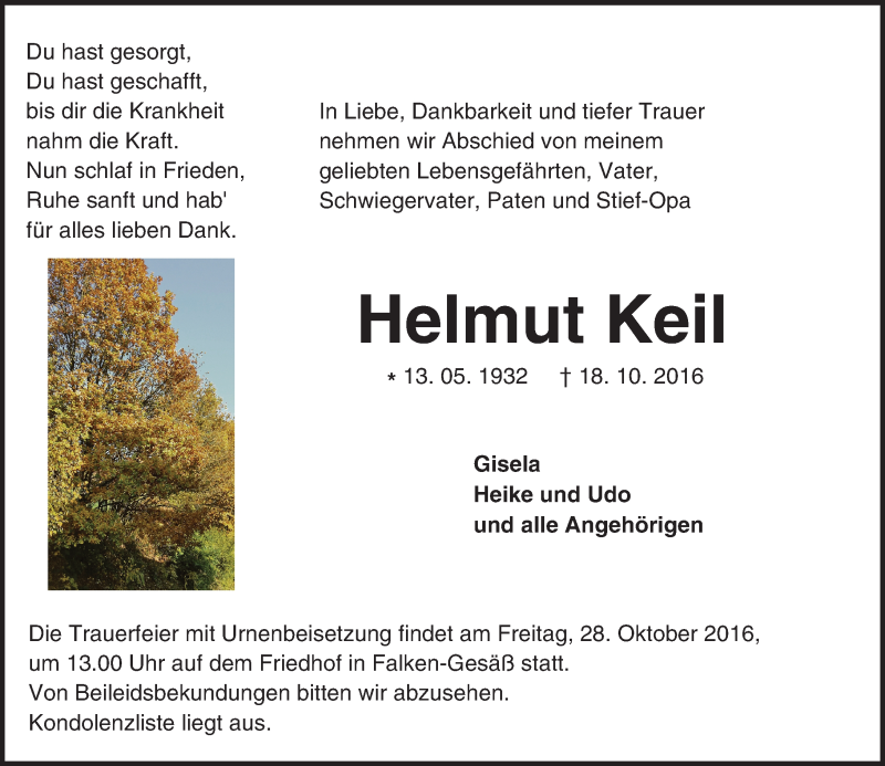 Hier finden Sie alle Traueranzeigen aus der Zeitung, die bisher für Helmut Keil erschienen sind. Weitere Traueranzeigen, die in der Zeitung erscheinen, werden hier ebenfalls aufgelistet