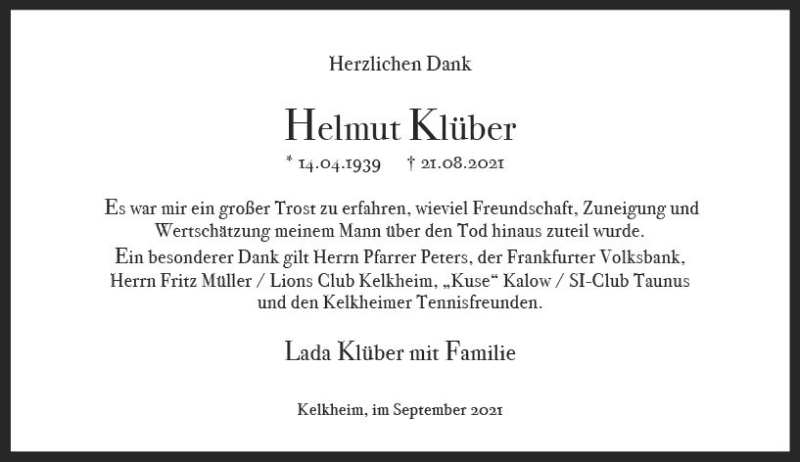 Hier finden Sie alle Traueranzeigen aus der Zeitung, die bisher für Helmut Klüber erschienen sind. Weitere Traueranzeigen, die in der Zeitung erscheinen, werden hier ebenfalls aufgelistet