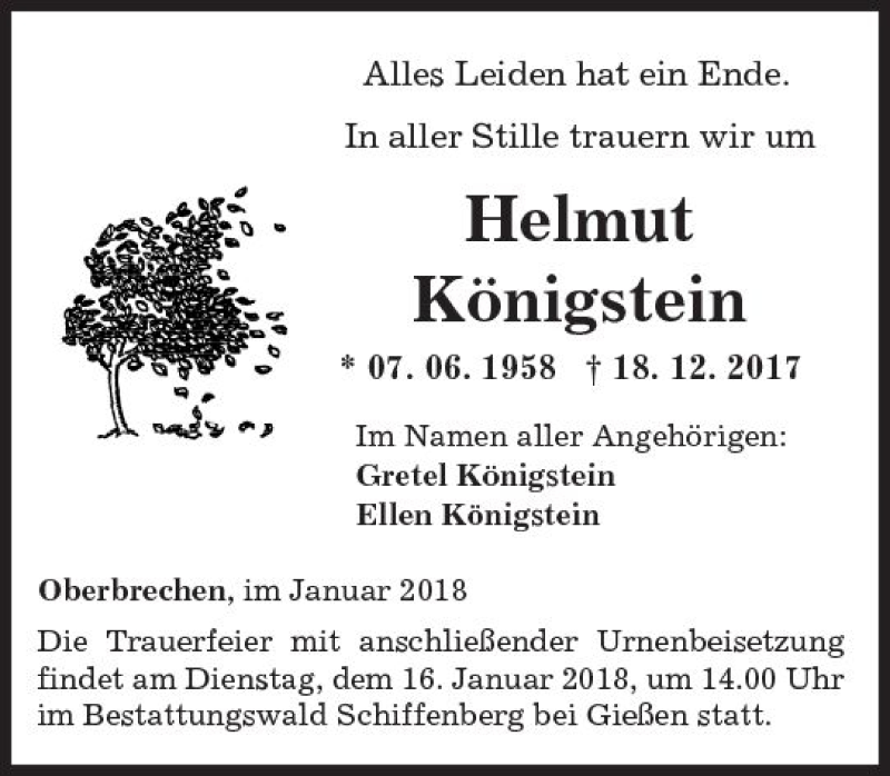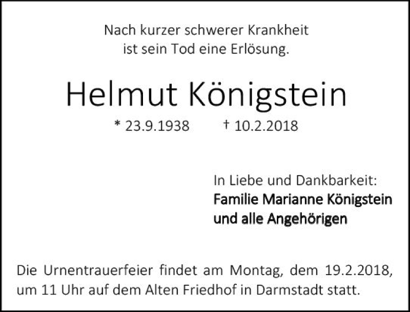 Hier finden Sie alle Traueranzeigen aus der Zeitung, die bisher für Helmut Königstein erschienen sind. Weitere Traueranzeigen, die in der Zeitung erscheinen, werden hier ebenfalls aufgelistet
