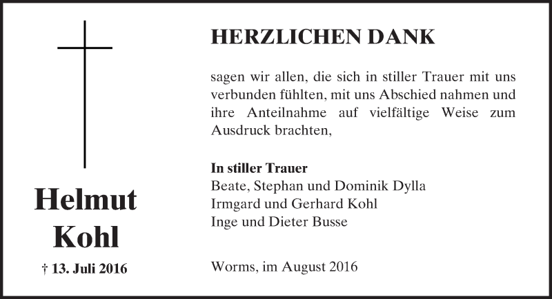 Hier finden Sie alle Traueranzeigen aus der Zeitung, die bisher für Helmut Kohl erschienen sind. Weitere Traueranzeigen, die in der Zeitung erscheinen, werden hier ebenfalls aufgelistet