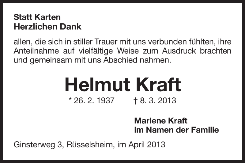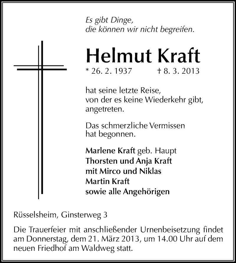 Hier finden Sie alle Traueranzeigen aus der Zeitung, die bisher für Helmut Kraft erschienen sind. Weitere Traueranzeigen, die in der Zeitung erscheinen, werden hier ebenfalls aufgelistet