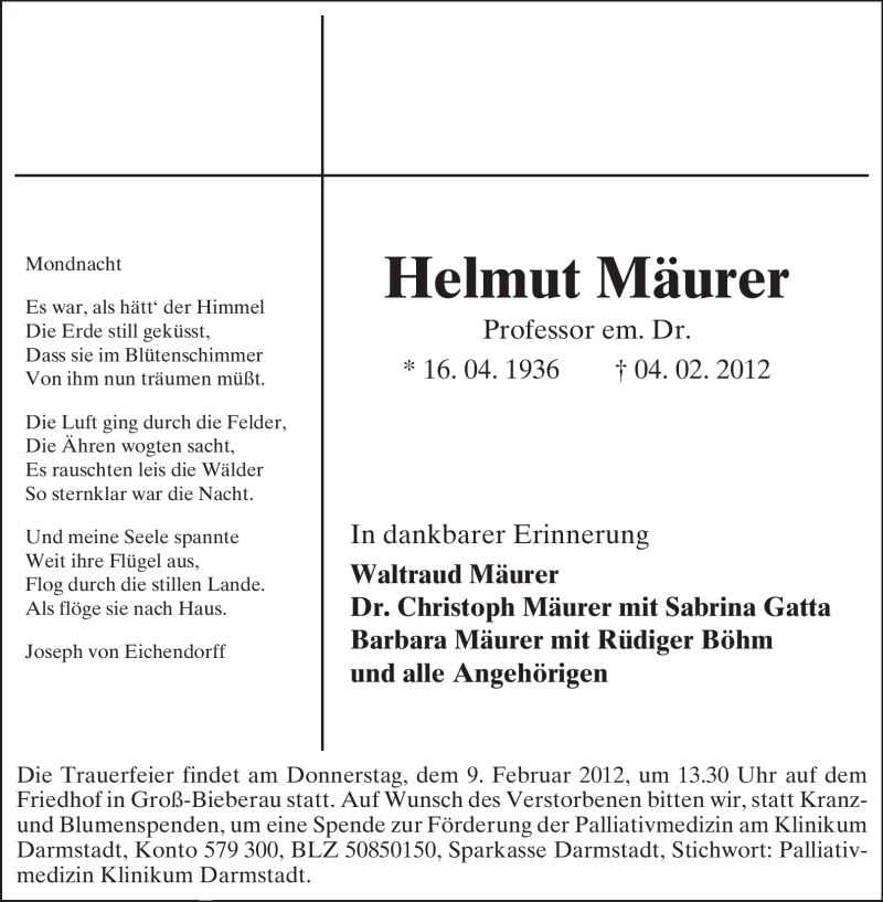 Hier finden Sie alle Traueranzeigen aus der Zeitung, die bisher für Helmut Mäurer erschienen sind. Weitere Traueranzeigen, die in der Zeitung erscheinen, werden hier ebenfalls aufgelistet