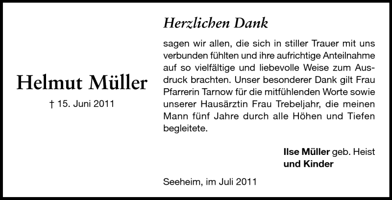 Hier finden Sie alle Traueranzeigen aus der Zeitung, die bisher für Helmut Müller erschienen sind. Weitere Traueranzeigen, die in der Zeitung erscheinen, werden hier ebenfalls aufgelistet