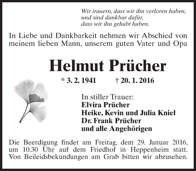 Hier finden Sie alle Traueranzeigen aus der Zeitung, die bisher für Helmut Prücher erschienen sind. Weitere Traueranzeigen, die in der Zeitung erscheinen, werden hier ebenfalls aufgelistet