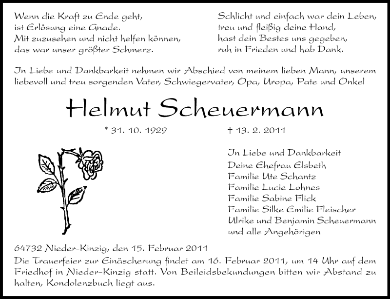 Hier finden Sie alle Traueranzeigen aus der Zeitung, die bisher für Helmut Scheuermann erschienen sind. Weitere Traueranzeigen, die in der Zeitung erscheinen, werden hier ebenfalls aufgelistet