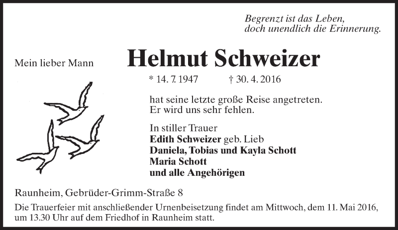 Hier finden Sie alle Traueranzeigen aus der Zeitung, die bisher für Helmut Schweizer erschienen sind. Weitere Traueranzeigen, die in der Zeitung erscheinen, werden hier ebenfalls aufgelistet