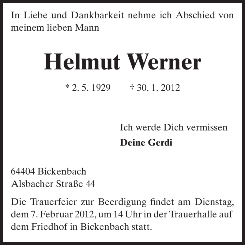 Hier finden Sie alle Traueranzeigen aus der Zeitung, die bisher für Helmut Werner erschienen sind. Weitere Traueranzeigen, die in der Zeitung erscheinen, werden hier ebenfalls aufgelistet