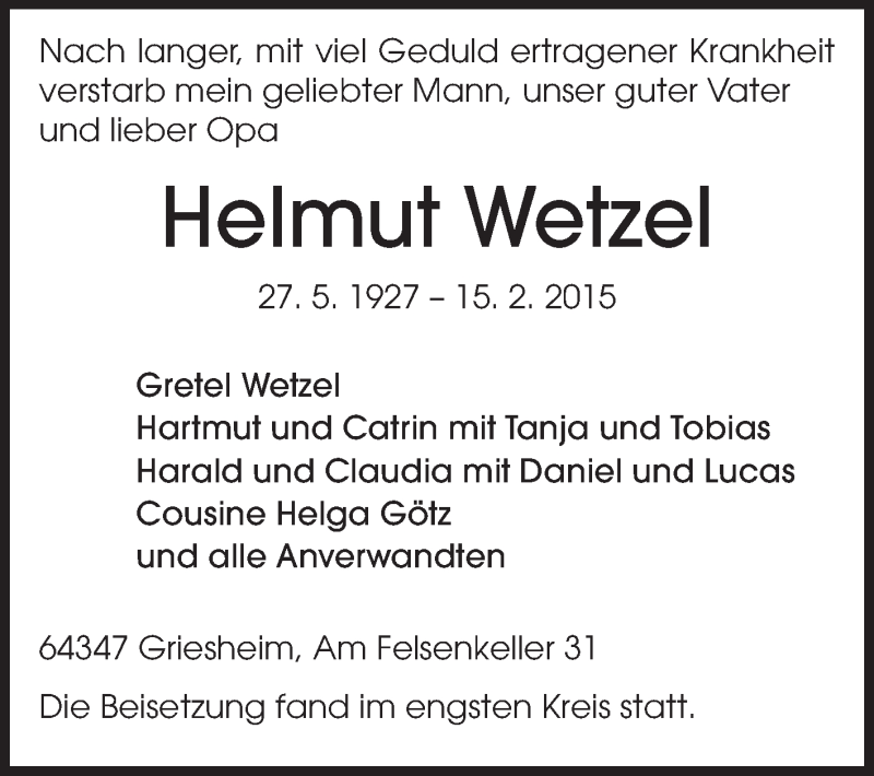 Hier finden Sie alle Traueranzeigen aus der Zeitung, die bisher für Helmut Wetzel erschienen sind. Weitere Traueranzeigen, die in der Zeitung erscheinen, werden hier ebenfalls aufgelistet