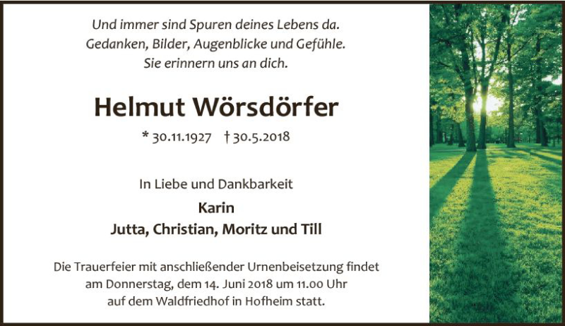Hier finden Sie alle Traueranzeigen aus der Zeitung, die bisher für Helmut Wörsdörfer erschienen sind. Weitere Traueranzeigen, die in der Zeitung erscheinen, werden hier ebenfalls aufgelistet