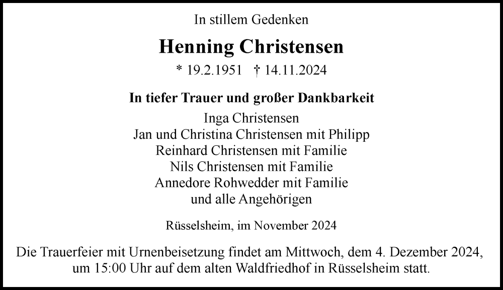 Hier finden Sie alle Traueranzeigen aus der Zeitung, die bisher für Henning Christensen erschienen sind. Weitere Traueranzeigen, die in der Zeitung erscheinen, werden hier ebenfalls aufgelistet