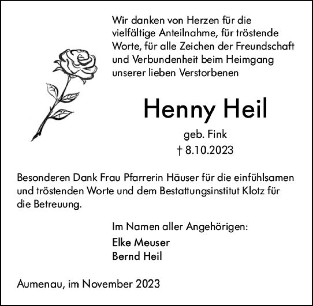 Hier finden Sie alle Traueranzeigen aus der Zeitung, die bisher für Henny Heil erschienen sind. Weitere Traueranzeigen, die in der Zeitung erscheinen, werden hier ebenfalls aufgelistet
