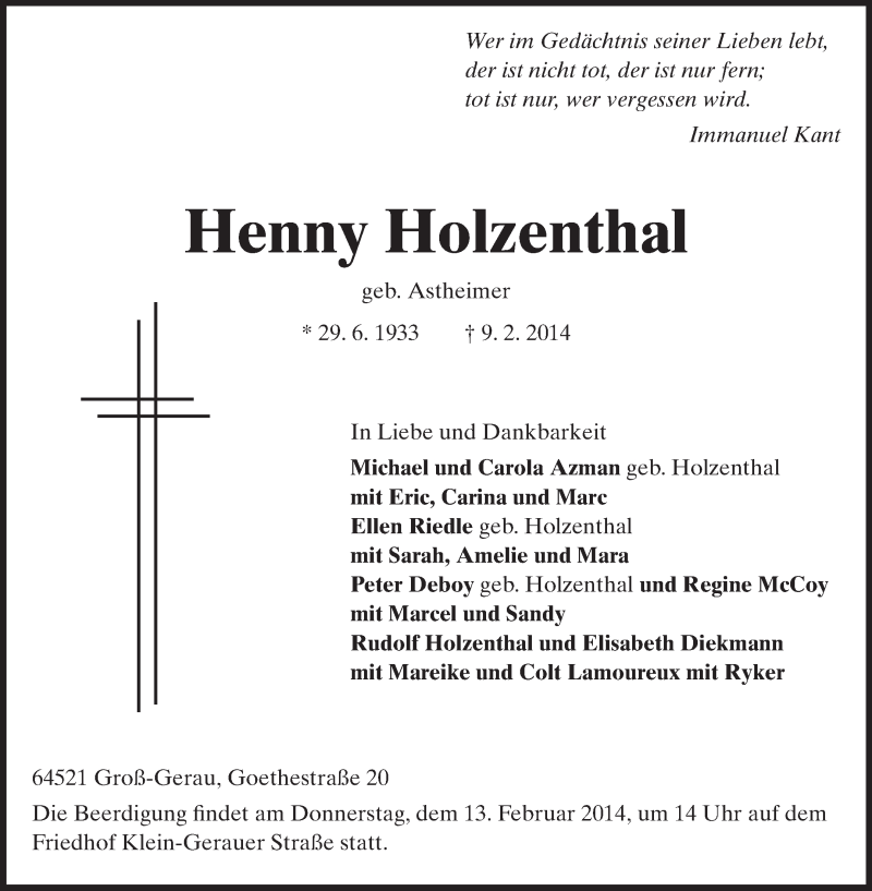 Hier finden Sie alle Traueranzeigen aus der Zeitung, die bisher für Henny Holzenthal erschienen sind. Weitere Traueranzeigen, die in der Zeitung erscheinen, werden hier ebenfalls aufgelistet