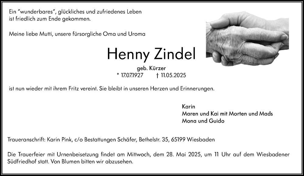 Hier finden Sie alle Traueranzeigen aus der Zeitung, die bisher für Henny Zindel erschienen sind. Weitere Traueranzeigen, die in der Zeitung erscheinen, werden hier ebenfalls aufgelistet