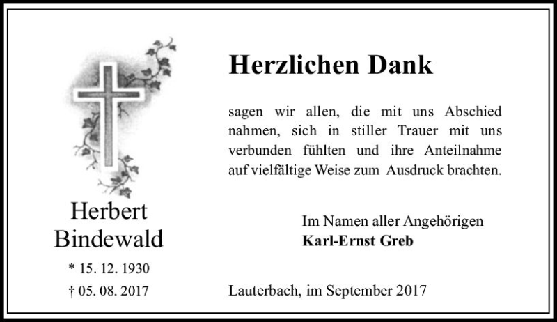 Hier finden Sie alle Traueranzeigen aus der Zeitung, die bisher für Herbert Bindwald erschienen sind. Weitere Traueranzeigen, die in der Zeitung erscheinen, werden hier ebenfalls aufgelistet