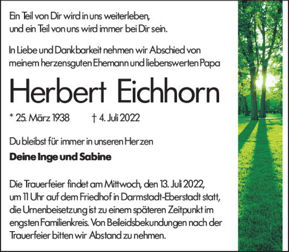 Hier finden Sie alle Traueranzeigen aus der Zeitung, die bisher für Herbert Eichhorn erschienen sind. Weitere Traueranzeigen, die in der Zeitung erscheinen, werden hier ebenfalls aufgelistet