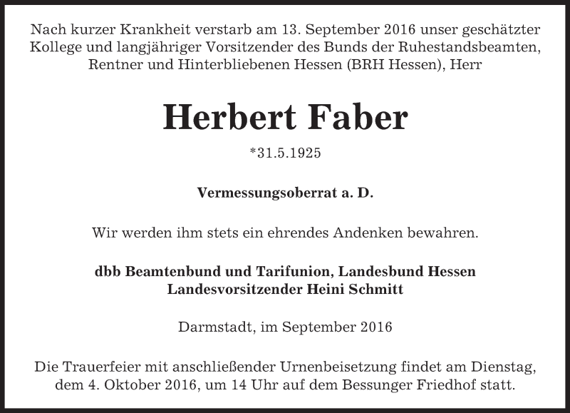 Hier finden Sie alle Traueranzeigen aus der Zeitung, die bisher für Herbert Faber erschienen sind. Weitere Traueranzeigen, die in der Zeitung erscheinen, werden hier ebenfalls aufgelistet