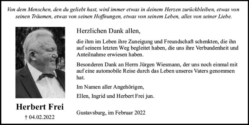 Hier finden Sie alle Traueranzeigen aus der Zeitung, die bisher für Herbert Frei erschienen sind. Weitere Traueranzeigen, die in der Zeitung erscheinen, werden hier ebenfalls aufgelistet