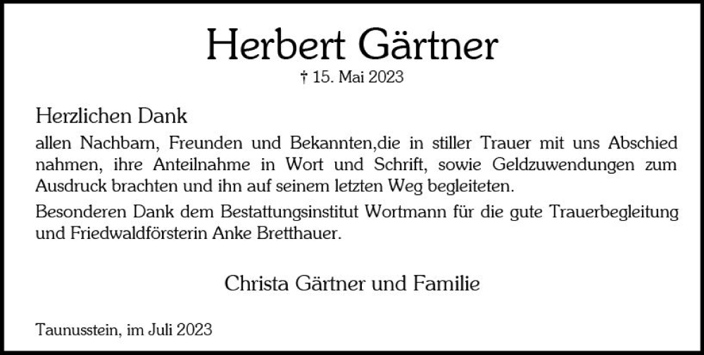 Hier finden Sie alle Traueranzeigen aus der Zeitung, die bisher für Herbert Gärtner erschienen sind. Weitere Traueranzeigen, die in der Zeitung erscheinen, werden hier ebenfalls aufgelistet