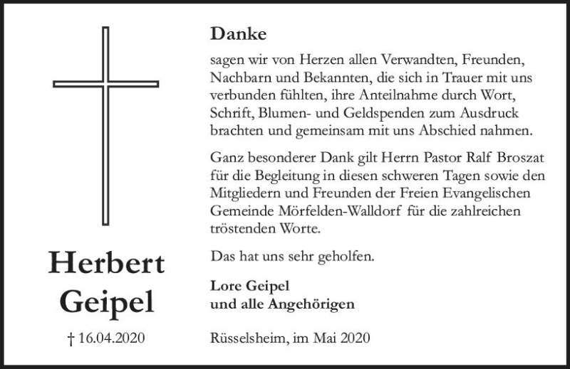 Hier finden Sie alle Traueranzeigen aus der Zeitung, die bisher für Herbert Geipel erschienen sind. Weitere Traueranzeigen, die in der Zeitung erscheinen, werden hier ebenfalls aufgelistet