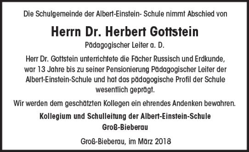 Hier finden Sie alle Traueranzeigen aus der Zeitung, die bisher für Herbert Gottstein erschienen sind. Weitere Traueranzeigen, die in der Zeitung erscheinen, werden hier ebenfalls aufgelistet