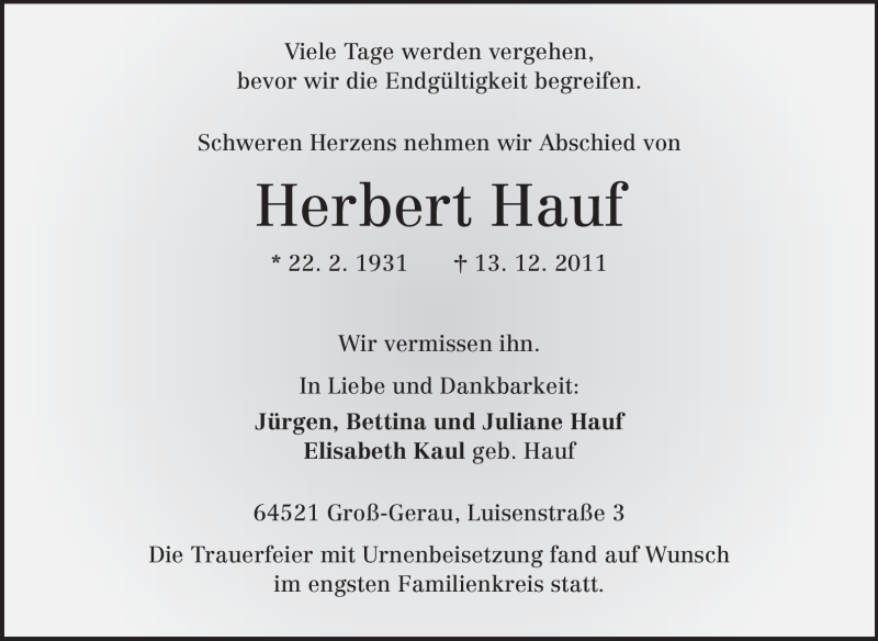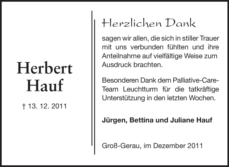 Hier finden Sie alle Traueranzeigen aus der Zeitung, die bisher für Herbert Hauf erschienen sind. Weitere Traueranzeigen, die in der Zeitung erscheinen, werden hier ebenfalls aufgelistet